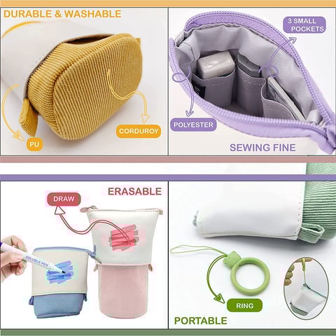 - ENOUGH CAPACITY - It divided into a main pocket and three smaller ones along the side.You can seriously fit a TON of pens in here,since it has a stand-up base.